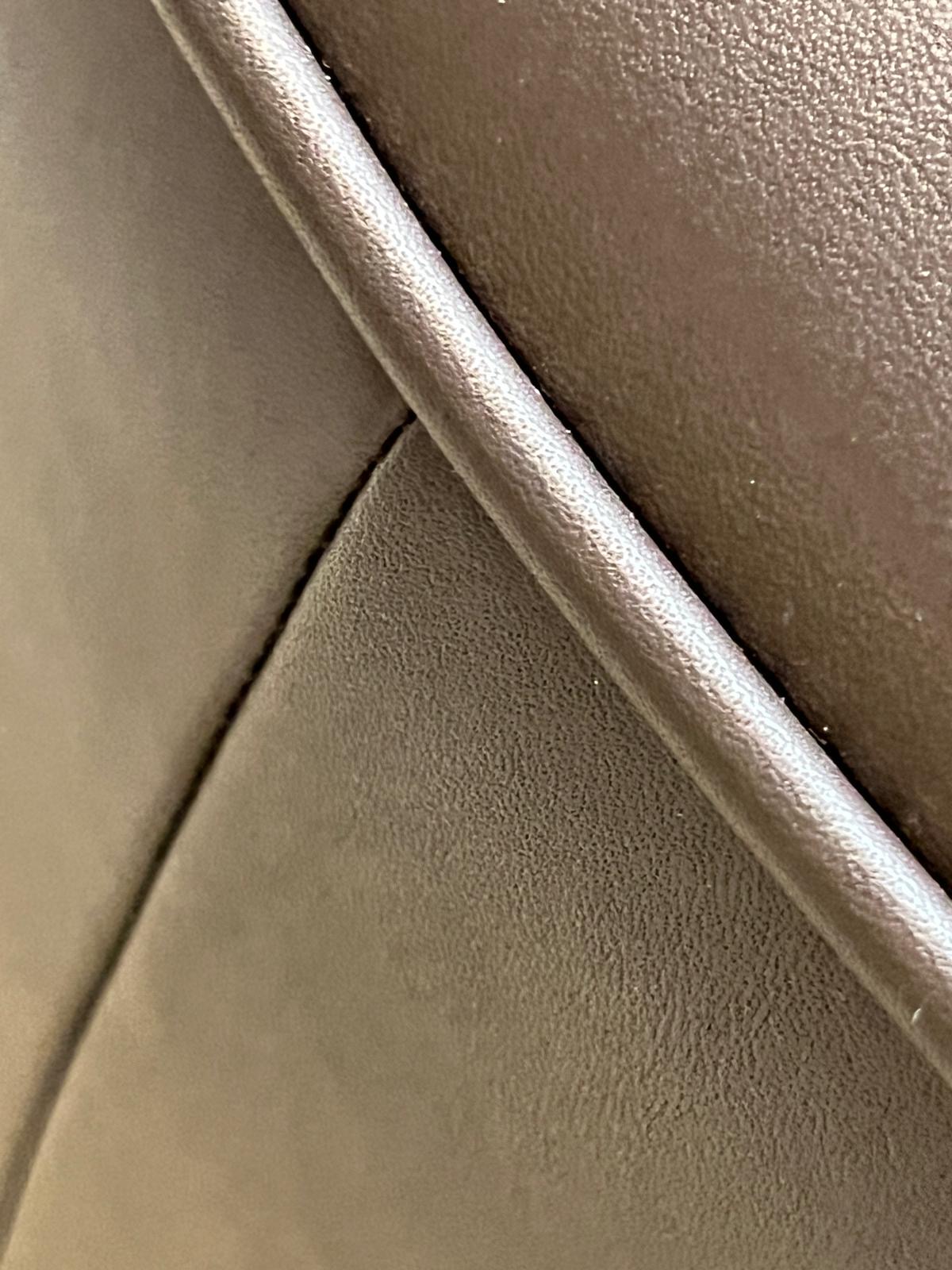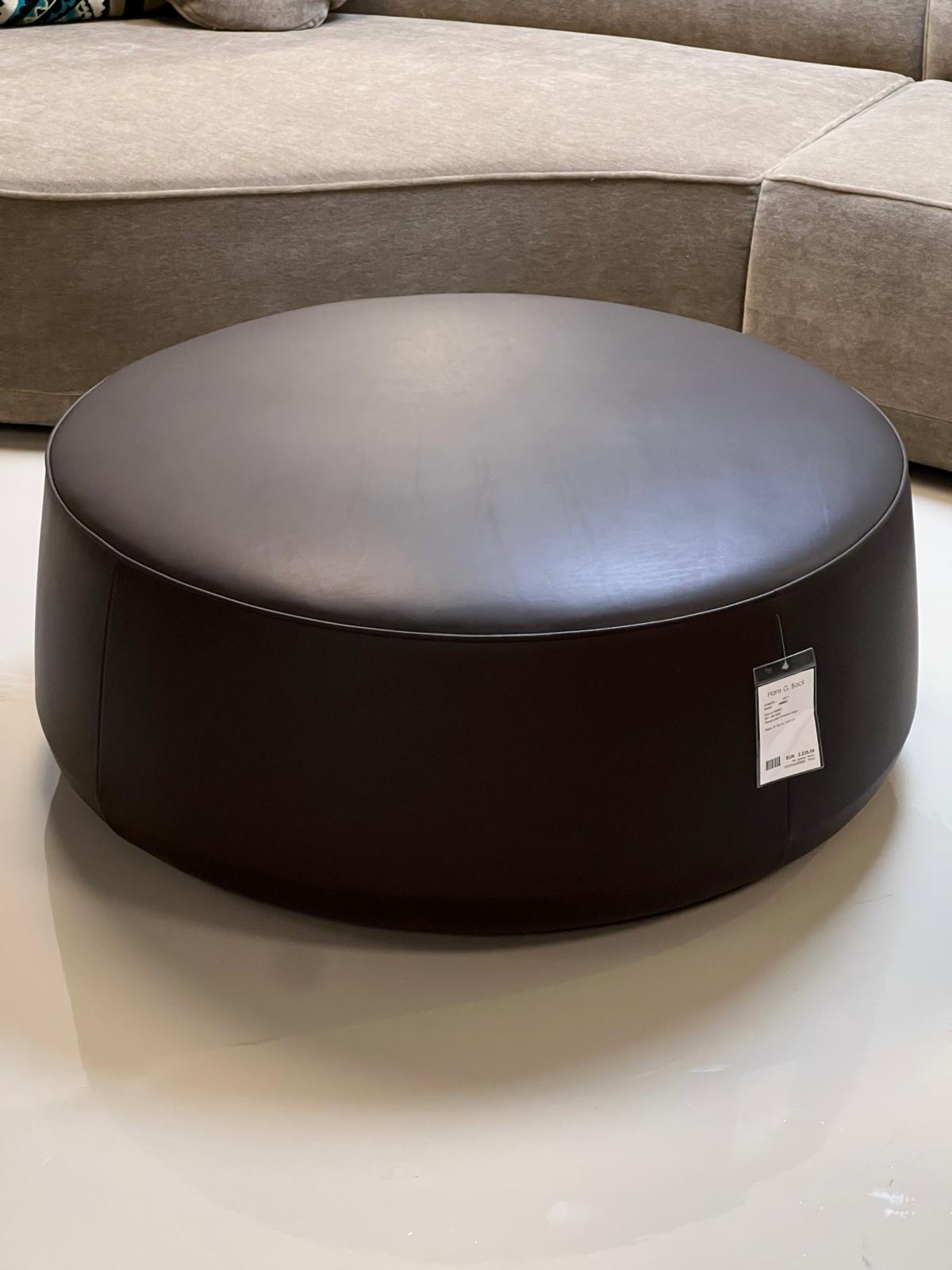 Die NIMBO Serie von den Bielefelder WERKSTÄTTEN vereint klare Formgebung mit luxuriösem Sitzkomfort und steht für exzellente deutsche Handwerkskunst. Seine weich modellierten Konturen und die großzügige Polsterung verleihen dem Hocker eine einladende, fast skulpturale Präsenz. Hier bezogen in dunkelbraunem Leder.